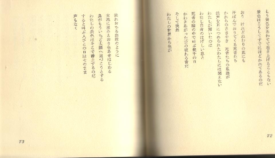 傷ついた遠目鏡の向こうに横たわった戦場のようにその乾きかけた地面からは静脈が怒りを含んで盛り上がり、草は寒い夜明け方の僕らの皮膚の如く